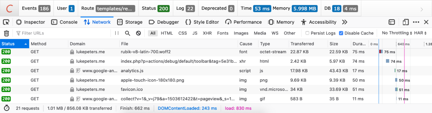Using my own website's home page as an example, let's look at the performance before and after template caching.