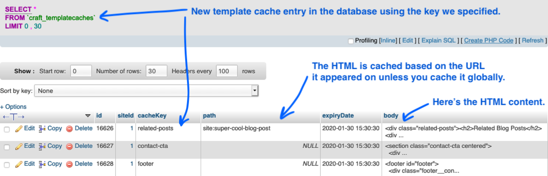 {% endcache %}Using the {% cache %} tag, Craft CMS will save the final HTML output (after all database queries) as a blob in the database. The next time the page is loaded, it just needs to fetch this blob of HTML rather than all of the content required to create the HTML newly.